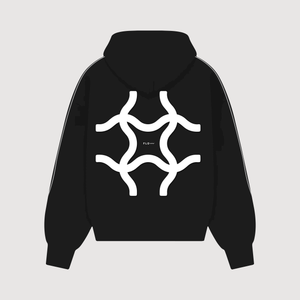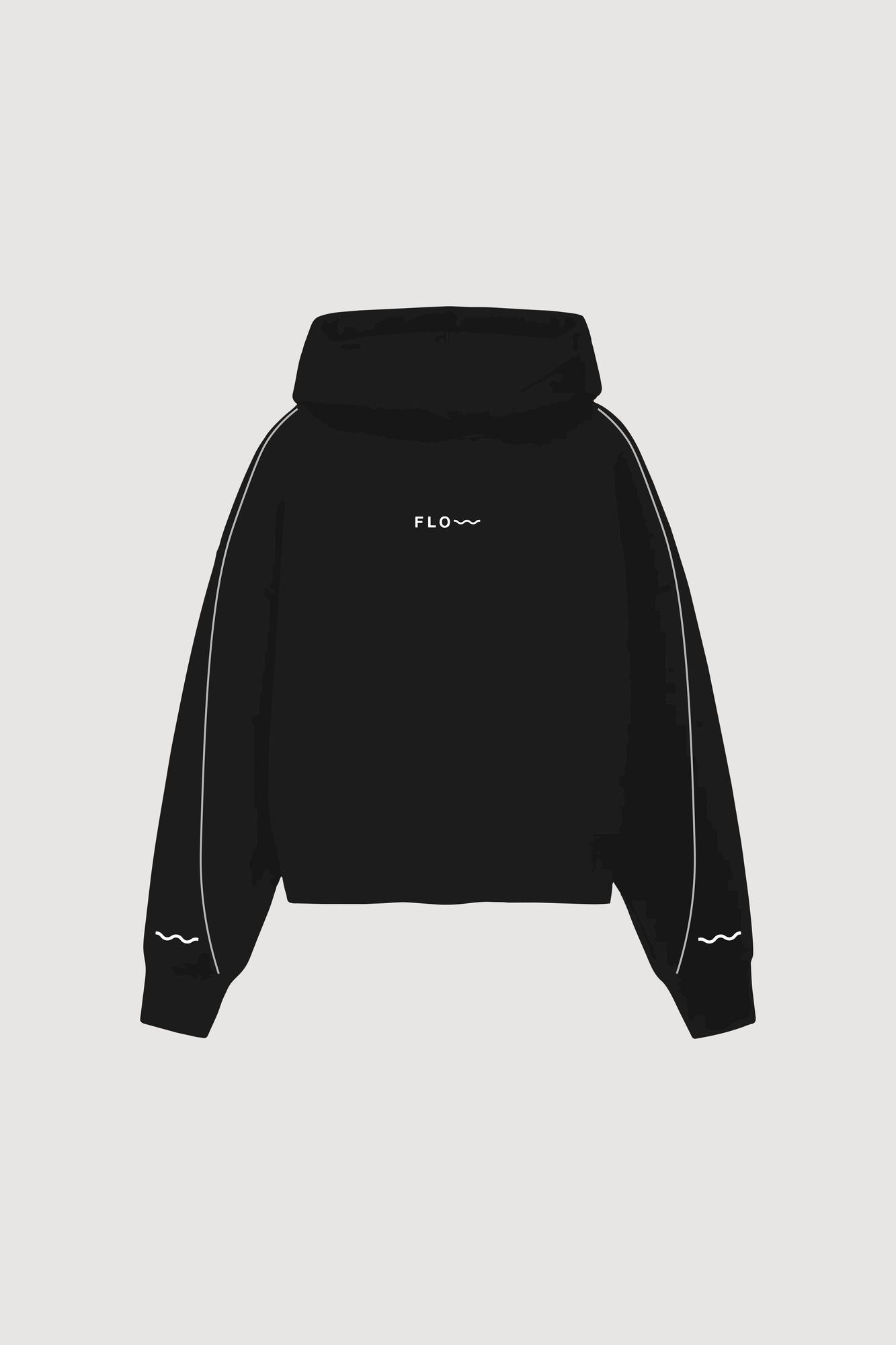 Black hoodie with Flow logo in front and Wave printed at back